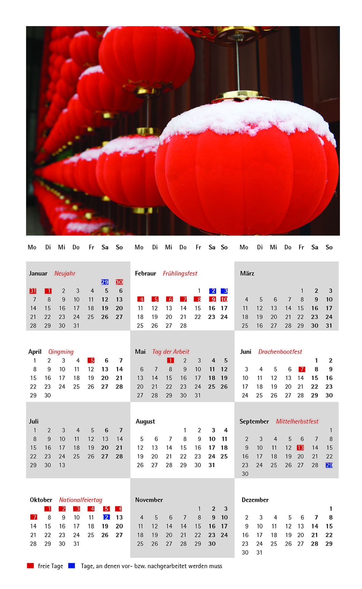 Am 6. Dezember hat der Staatsrat der VR China die Regelungen für die Feiertage im Jahr 2019 festgelegt. Danach muss lediglich zum Jahreswechsel 2018/2019 sowie zu den beiden "Goldenen Wochen" vor- bzw. nachgearbeitet werden. Konkret heißt dies, zum Jahreswechsel 2018/2019 werden drei freie Tage gewährt – vom 30.12.2018 bis zum 1.1.2019. Als Ausgleich muss am 29.12.2018 gearbeitet werden. Die "Goldene Woche" zum Frühlingsfest geht vom 4. Februar bis zum 10. Februar 2019. Am 2. und 3. Februar (Samstag und Sonntag) muss vorgearbeitet werden. Diskussion über den freien Tag am Silvester-Abend dürfte es in diesem Jahr nicht geben. Silvester (除夕) ist am 4. Februar, Neujahr (春节) am 5. Februar. Zum Nationalfeiertag sieht die Regelung sieben freie Tage vom 1. bis 7. Oktober 2019 vor. Zum Ausgleich muss am 29. September (Sonntag) vor- und am 12. Oktober (Samstag) nachgearbeitet werden. Bis auf den 1. Mai liegen alle Feiertag so, dass einschlich Wochenende drei aufeinander folgende Tage frei sind. Erstmals wird im kommenden Jahr zum Tag der Arbeit nicht vor- oder nachgearbeitet. Es ist lediglich am eigentlichen Feiertag, der auf einen Mittwoch fällt, frei.